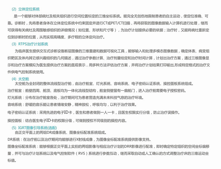 (7)应用IGRT图像引导功能实现治疗过程的校验、调整及质量控制;(8)引入全封闭流线型“太空舱”新理念,让患者的治疗在安静舒适的“太空舱”环境中体验完成。