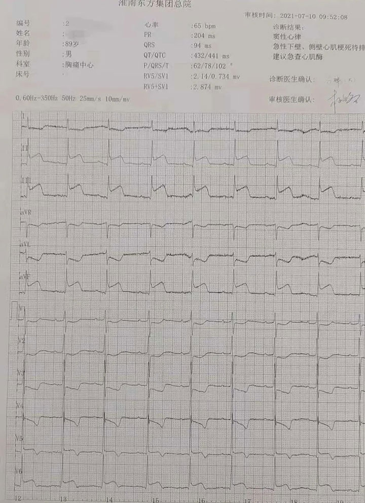 “心电图显示急性下壁、侧壁心肌梗死,启动绿色通道!”东方总院胸痛中心医护人员立刻启动胸痛急救程序,从入院到手术结束,仅用50分钟便从死神手中将这位89岁高龄患者的生命夺了回来!