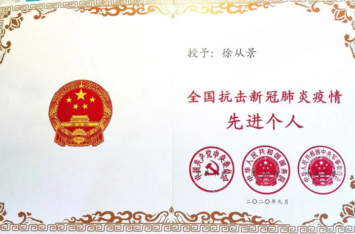 由于在抗疫表现中表现突出,徐从景教授先后获得全国抗击新冠肺炎疫情先进个人、安徽省抗击新冠肺炎疫情先进个人、安徽省优秀共产党员、淮南好人等多项重量级荣誉称号。但他并没有因此而有所改变,而是很快回归岗位,重新走近患者、走进病房。如今,徐从景教授退休返聘,担任集团呼吸内科专业首席专家、集团呼吸内科医疗中心顾问,还是穿着那件白大褂,每周不停地奔波在总院、肿瘤医院、广济、济民等各家医院之间,继续着他的医生梦想……