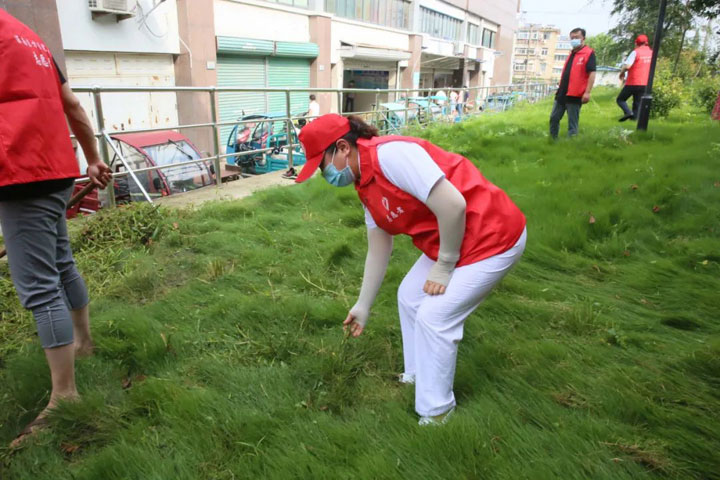 连日的雨水使洞泉小区绿化草坪上杂草丛生,里面隐藏许多蚊虫、垃圾,形成了难以清理的卫生死角。志愿者们在上有烈日,脚下淤泥的情况下对杂草进行拉网式的处理。除草师傅用除草机将齐人高的杂草斩断,志愿者用耙子和铁锹将杂草摞到一边,遇到难以斩断的低矮藤条,大家就用手拔起。经过近2个小时的辛勤劳动,机关支部的志愿者们终于将 20多平方的杂草全部清理干净。