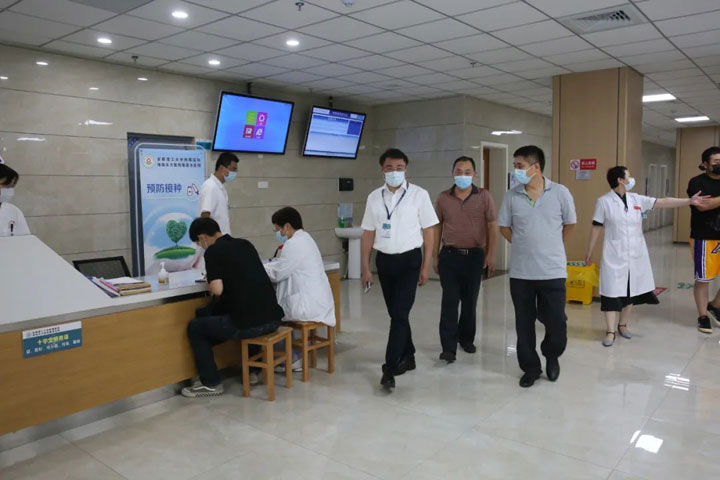 王处长一行扫码、测温进入门诊大楼,查看了等候区、登记区、接种区、留观区等,并按照接种流程逐一巡查各环节工作,询问留观人员是否清楚疫苗注射后的注意事项等。在认真听取江永强董事长关于疫情防控工作及疫苗接种工作进展情况汇报后,对东方总院门诊预防接种的工作给予了充分肯定。
