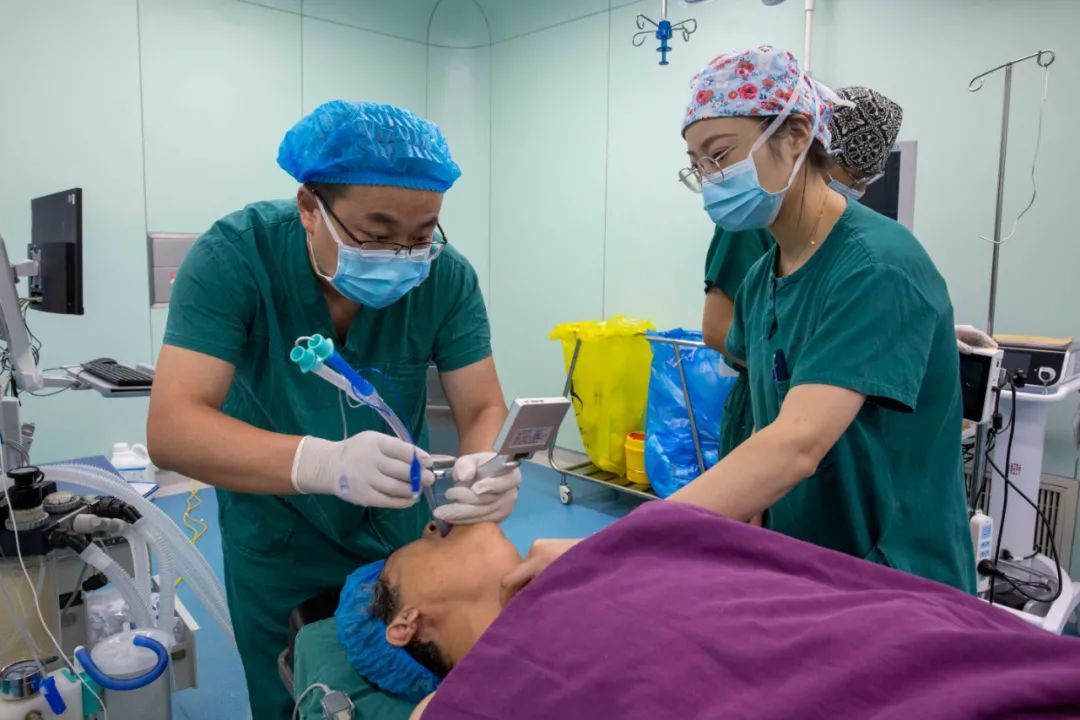 “纤支镜引导下气管切开的优势,就是可视化,全程可以监测大气道内的情况,全程可以看到穿刺针的穿刺深度、扩皮器插入深度、导丝的走向、气管切开钳进入深度及扩张程度等,为手术提供最大帮助!”徐宗雪副主任介绍。