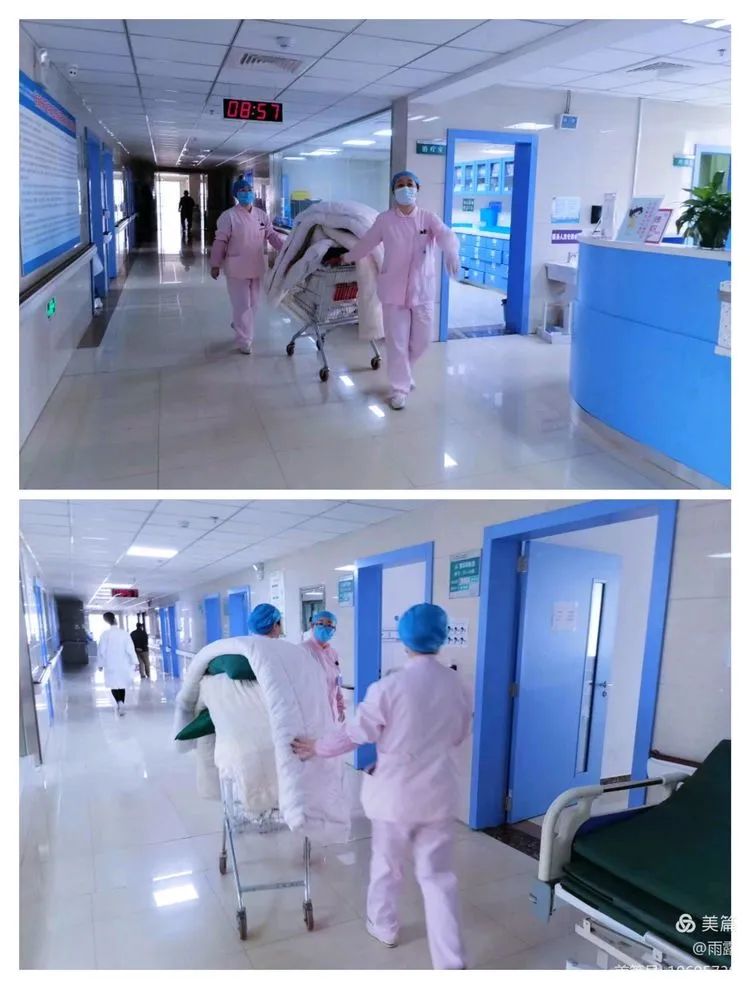为患者准备床铺,别看是娇弱女子,干起活来,其实个个都是女汉子。