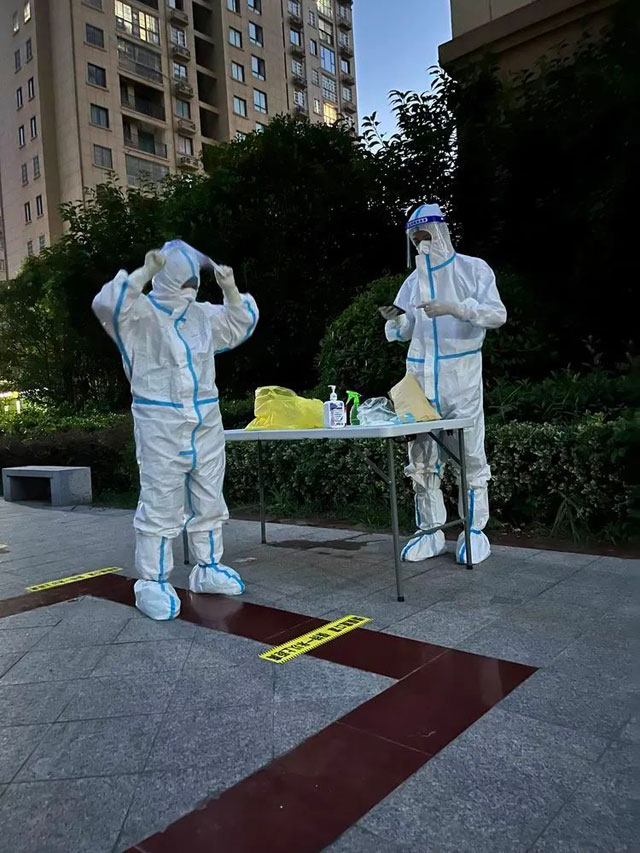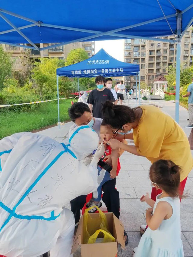 正在采样的是队里的段夏夏和桂钰,她们的头上没有一点遮挡,最高气温41℃的户外,每一个穿着防护服采样的大白都在挑战身体的极限。她赶紧上前,一起帮忙采样。取出棉签、旋转咽拭子,放进试剂管、压断棉签,不远处的采样点又有人倒下,然后别的点完成的同事像她一样被喊来支援,她看到队里的王春晖也来了,这个不爱说话的同事,喜欢一个人坐在角落里安静的看手机,每天回去最晚的总是他。队里的三个男生,每一次分任务,都挑最重的去。
