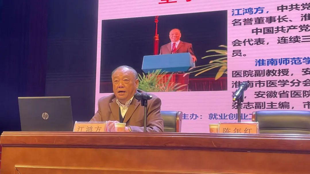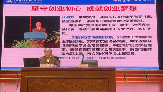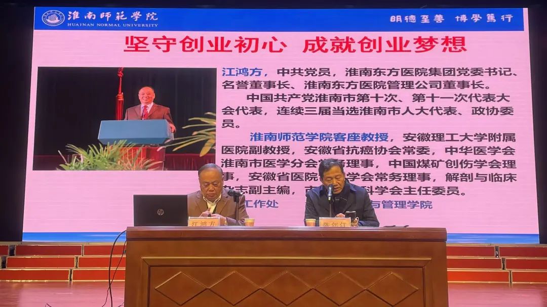 2022年11月30日下午,淮南东方医院集团党委书记、名誉董事长、淮南东方医院管理公司董事长、淮南师范学院客座教授江鸿方应邀为淮南师范学院大学生做题为《坚守创业初心,成就创业梦想》的创新创业专题报告,报告由淮南师范学院党委书记陈年红主持。