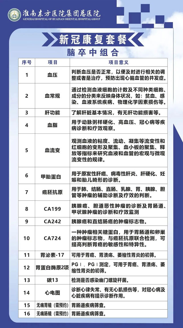 淮南东方总院体检中心现针对不同情况推出四套“阳康”特惠体检套餐,在一天内就可完成检查,用最快捷方便的方式为您的健康保驾护航!相较于日常体检,四项“阳康”套餐对于个人和团队都有大幅优惠,同时将由专家将为您解读报告、进行疾病风险评估,对于筛查出有病毒性肺炎、病毒性心肌炎等疾病的高危客户,医院会安排尽快就诊,提供一站式服务,努力为大众健康保驾护航。