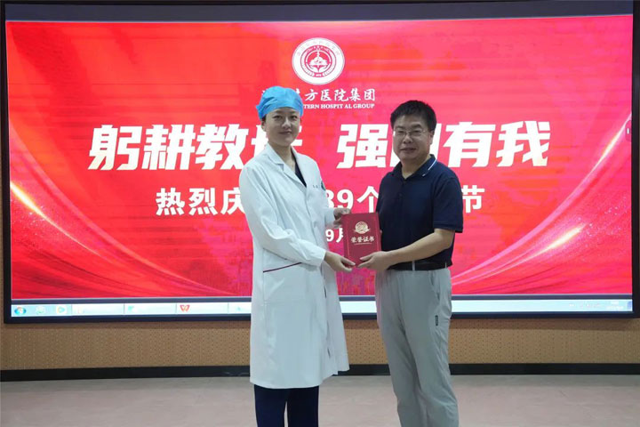 朱胜、刘立军还为叶林林和铁园园老师颁发了“教坛新秀”荣誉证书。两位老师都是东方医院集团年轻一代的优秀教师代表,他们在教学中勇于探索、积极创新,注重培养学生的综合素质和能力,受到了学生们的广泛欢迎和好评。此次荣誉证书的颁发是对他们所取得成绩的充分肯定和鼓励,也是对他们未来工作的展望和支持。