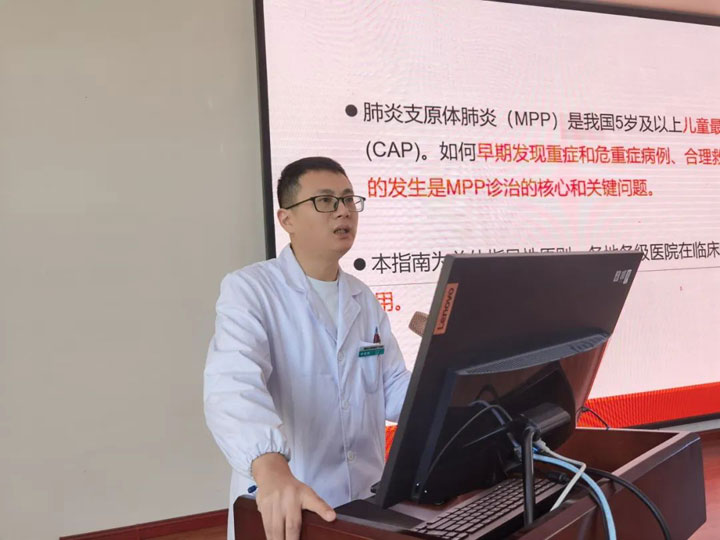 针对这一情况,广济医院积极响应上级部门要求,于近日在三楼会议室组织开展《儿童肺炎支原体肺炎诊疗指南(2023)》业务培训。邀请儿科主任李亚辉,与各科室共同学习解读“儿童肺炎支原体肺炎”的诊疗要点。