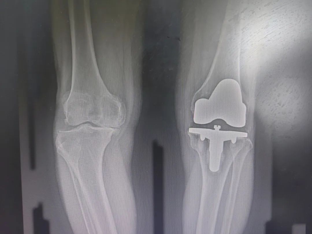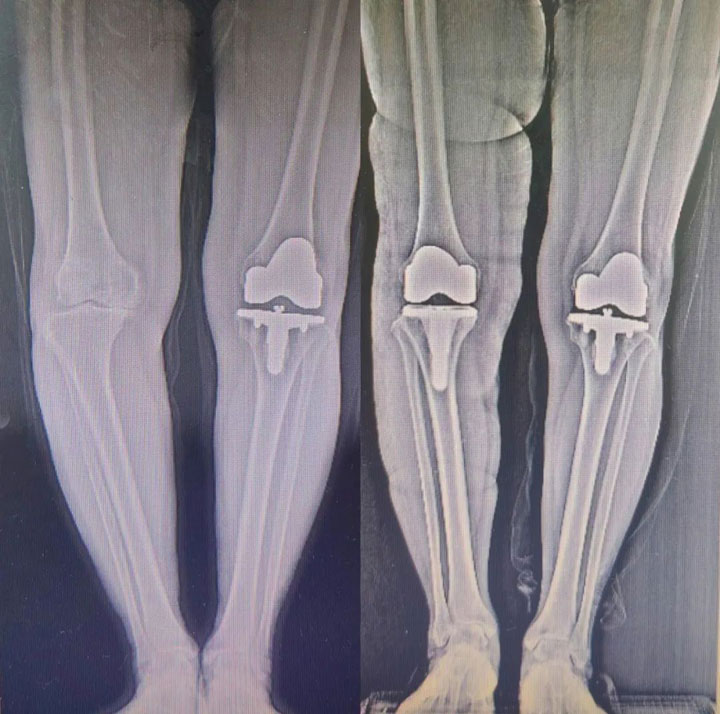 “患者大概3年前做的左膝关节置换术。当时右膝已经出现疼痛症状,近一个月内患者右膝关节反复疼痛,晨僵时间持续约30分钟,活动时有骨擦音。结合影像诊断,确诊为‘右侧膝关节骨性关节炎'。”骨科王怀波主任说。
