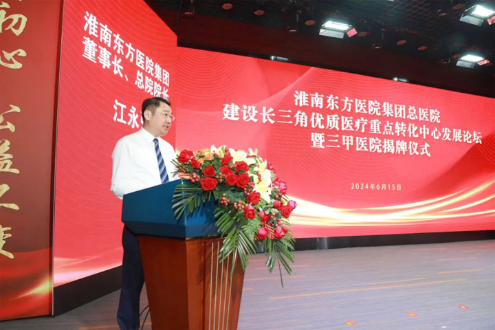 在揭牌仪式上,淮南东方医院集团董事长江永强首先代表医院集团党委、董事会以及医院全体职工,向莅临本次活动的各位领导、专家致以最热烈的欢迎和最衷心的感谢。同时他表示,“三甲”是几代东方人的梦想,在逐梦前行的道路上,全体东方人以梦为马,不负韶华,以坚定的信念和不屈的精神,用奋斗和汗水书写着属于东方人的壮丽篇章,让三甲的梦想在不懈的奋斗中逐步成为现实。三甲的成功不仅是医院发展史上的重要里程碑,更是迈向高质量发展的新起点、新征程,展望未来,东方总院将继续践行初心,保持公益不变,以三甲医院标准为基石,奋力打造让党放心、人民满意、员工幸福的现代化医院,全力谱写医院高质量发展新篇章!