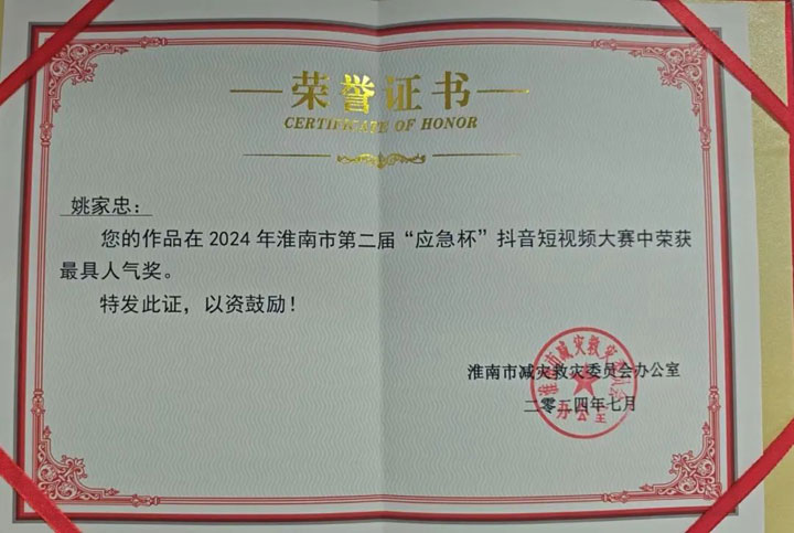近日,由淮南市减灾救灾委员会办公室举办的2024年淮南市第二届“应急杯”抖音短视频大赛落下帷幕,经过专家组评审,东方总院急诊科副主任姚家忠的作品荣获最具人气奖,并获得大赛奖金1000元整。