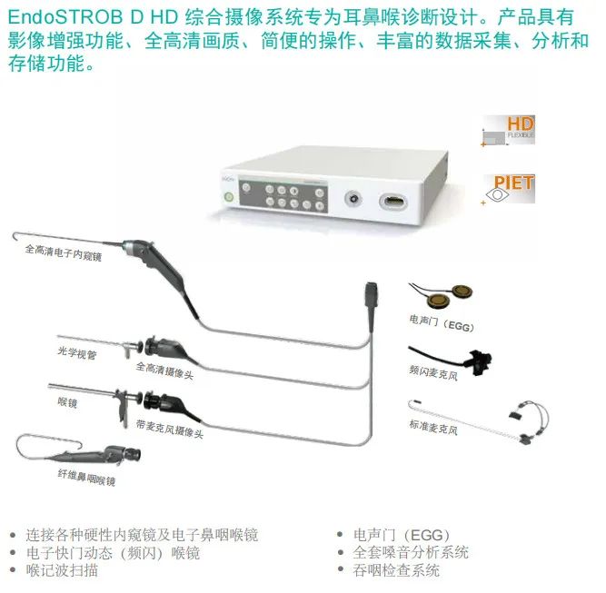 EndoSTROB D HD 综合摄像系统支持全部耳鼻喉门诊和手术的影像应用,系统构建了一套完整的多功能的诊断和手术系统 ,为患者提供了极佳的图像质量和舒适的体验。新一代的EndoSTROB D HD 摄像平台作为全高清内窥镜摄像、动态喉镜及电声门设备,借助全新的逐行扫描自动调光影像增强诊断技术,能提供超群的图像质量、最优亮度和色彩还原。双灯设计的 XION MATRIX LED duo 2 医用冷光源可避免内窥镜前端过热,显著提高病人的舒适度。