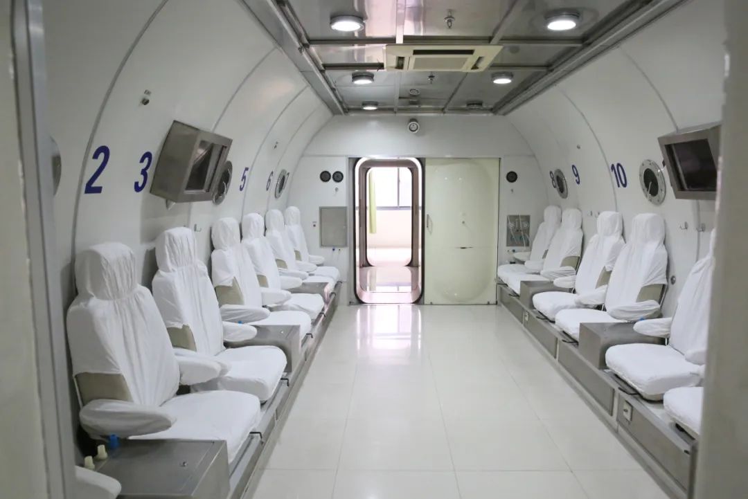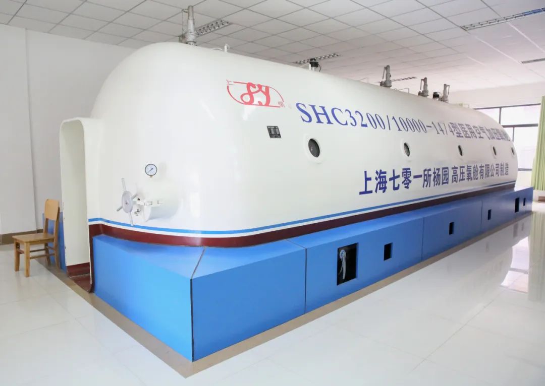 东方总院引进的SHC3200*10000型医用空气加压氧舱采用了随动升降耐压自封门、氧舱内电视显示系统、氧气加温加湿系统、计算机管理、触摸屏操舱系统等九项先进的技术、设备。舱内装饰美观、舒适,可同时容纳18人进舱治疗,达到了国内先进水平。