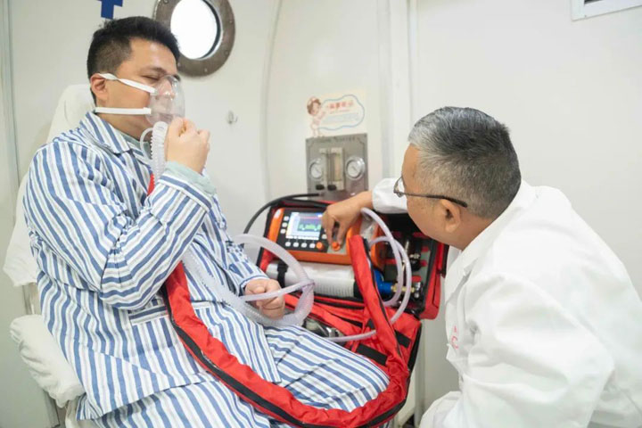 高压氧舱内呼吸机的使用,是目前高压氧医学领域内较为先进和重要的治疗技术。舱内专用的呼吸机克服了以电源为动力的呼吸机不能进舱的局限性,使危重症患者早期高压氧治疗成为可能,也实现了淮南高压氧行业带呼吸机进行高压氧治疗从无到有的突破。