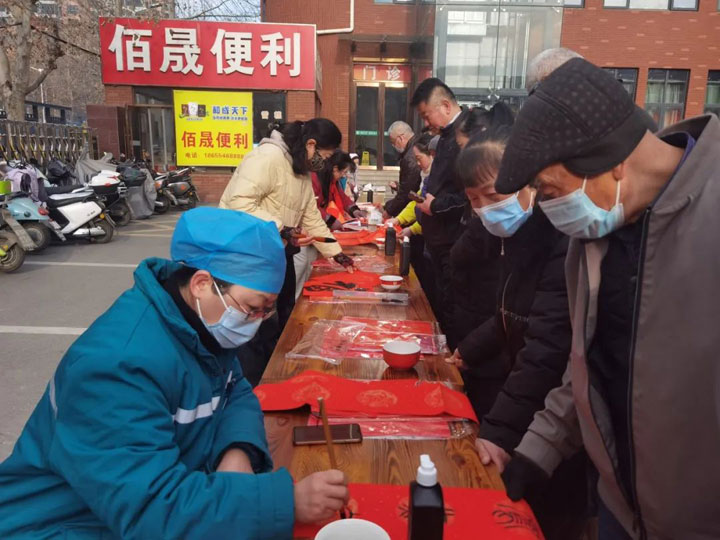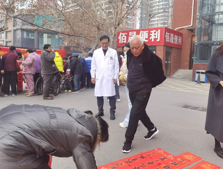 各位书法老师挥毫泼墨、笔走龙蛇,“龙腾四海雄风在,蛇舞九州瑞气生”“春回大地百花艳,日暖神州万象新”“灵蛇献瑞福满院,喜气盈门岁月新”一幅幅寓意吉祥、福气满满的春联跃然纸上,为即将到来的新春佳节增添了文化韵味。居民和患者家属手捧心仪的春联和大大的“福”字,难掩笑意。“我写了好几副,给同病房地也带了。这字写得真好,大红对联看着就喜庆,过年喽!”“小时候家里都是手写对联,还是这样更有年味!”在浓浓的墨香中,大家感觉年的气息也越来越近了。