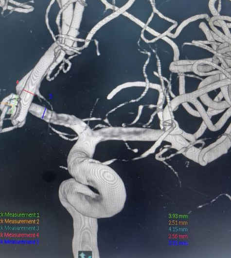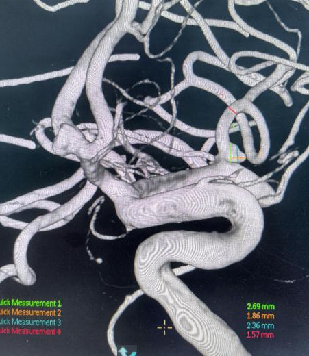 面对大动脉瘤且血管条件差的患者(腹主动脉S型迂曲,右侧颈总动脉II型牛角弓),以及颈内动脉多发动脉瘤的不同患者(C5-C7有5枚动脉瘤),吴全主任团队运用密网支架对症治疗,用一个支架巧妙解决大动脉瘤或多个动脉瘤难题,效果良好,患者短时间内快速恢复。