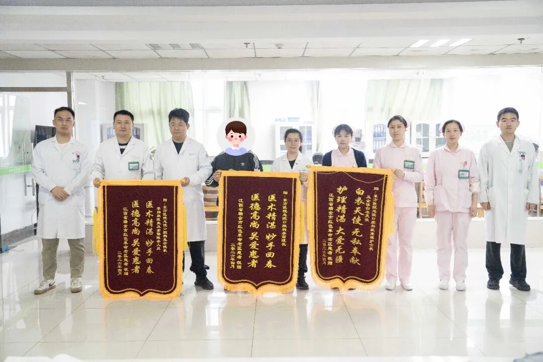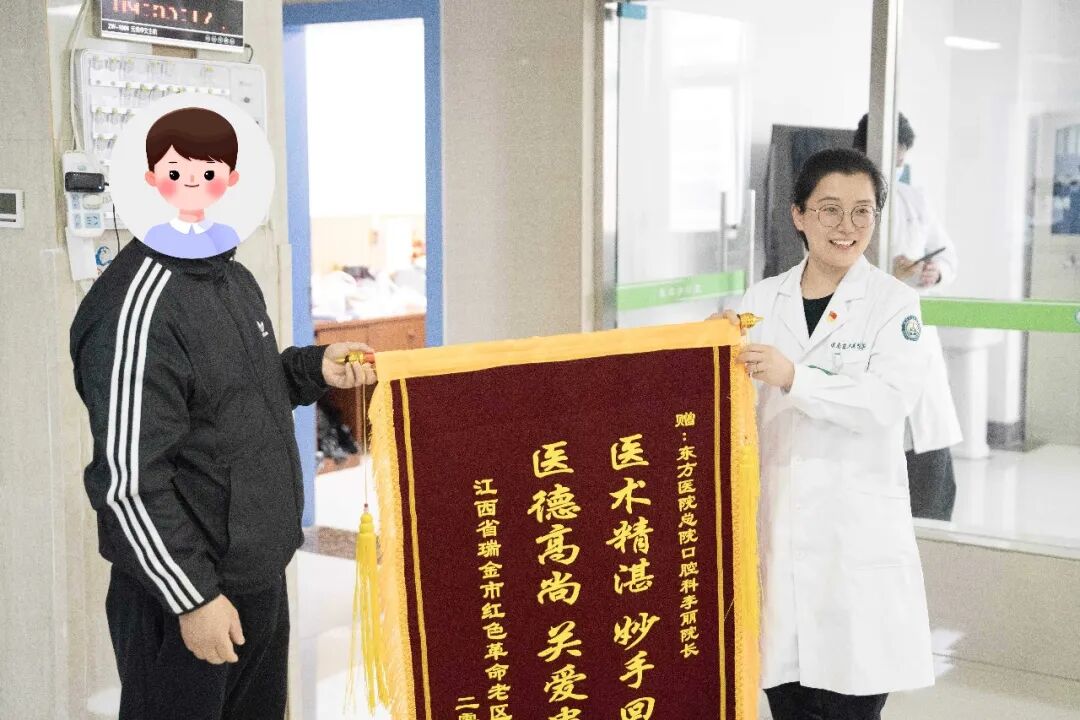 患者康复后,其女婿专程来到东方总院口腔科,亲手送上三面锦旗,以表达对李丽院长,全体医护人员的诚挚感谢。锦旗上的烫金话语,凝聚着患者家属对医疗团队高超技术与悉心照护的高度认可,也成为医患之间深厚情谊的生动写照。